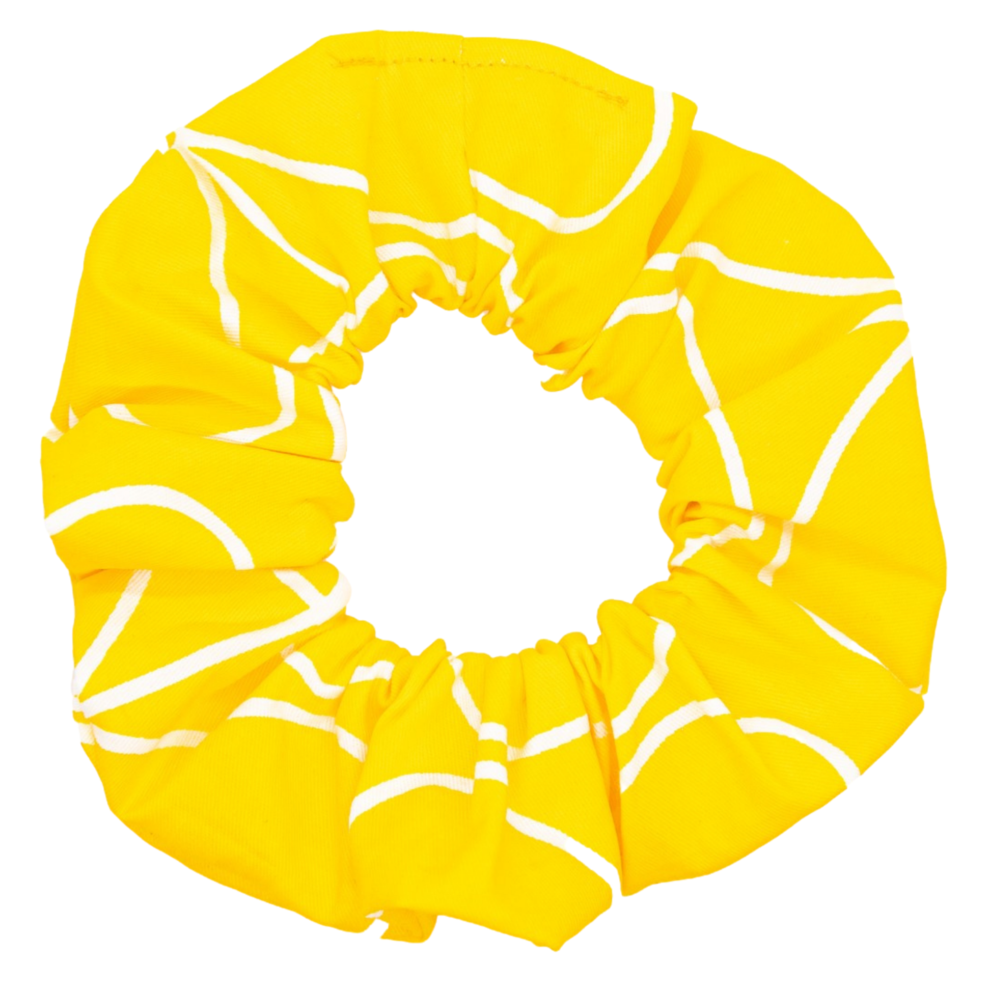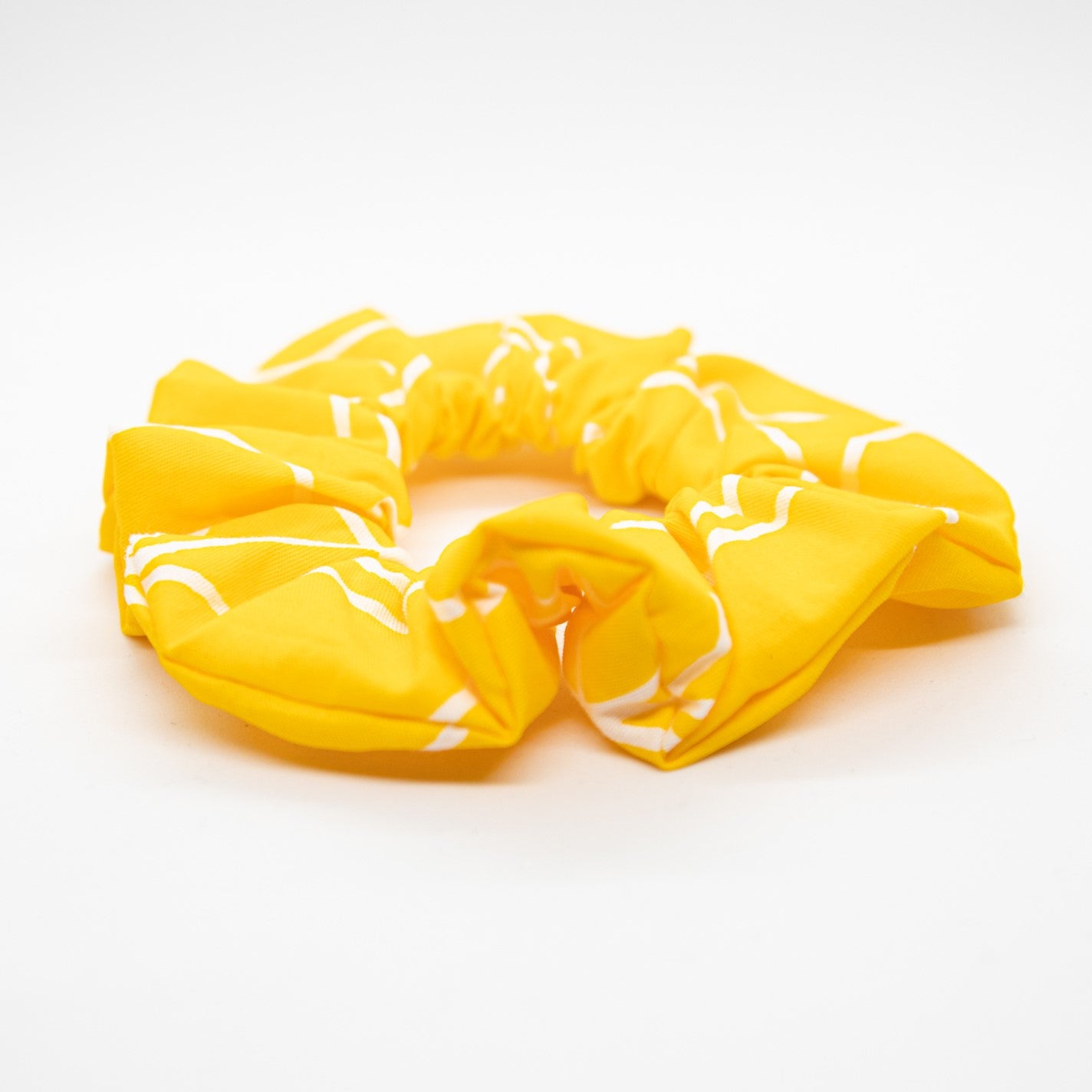 When laid out, this print is actually the outline of leaves, but when sewed into this scrunchie, it created a cool abstract pattern. This yellow is bold and will really add a nice pop of saffron yellow to your hair.