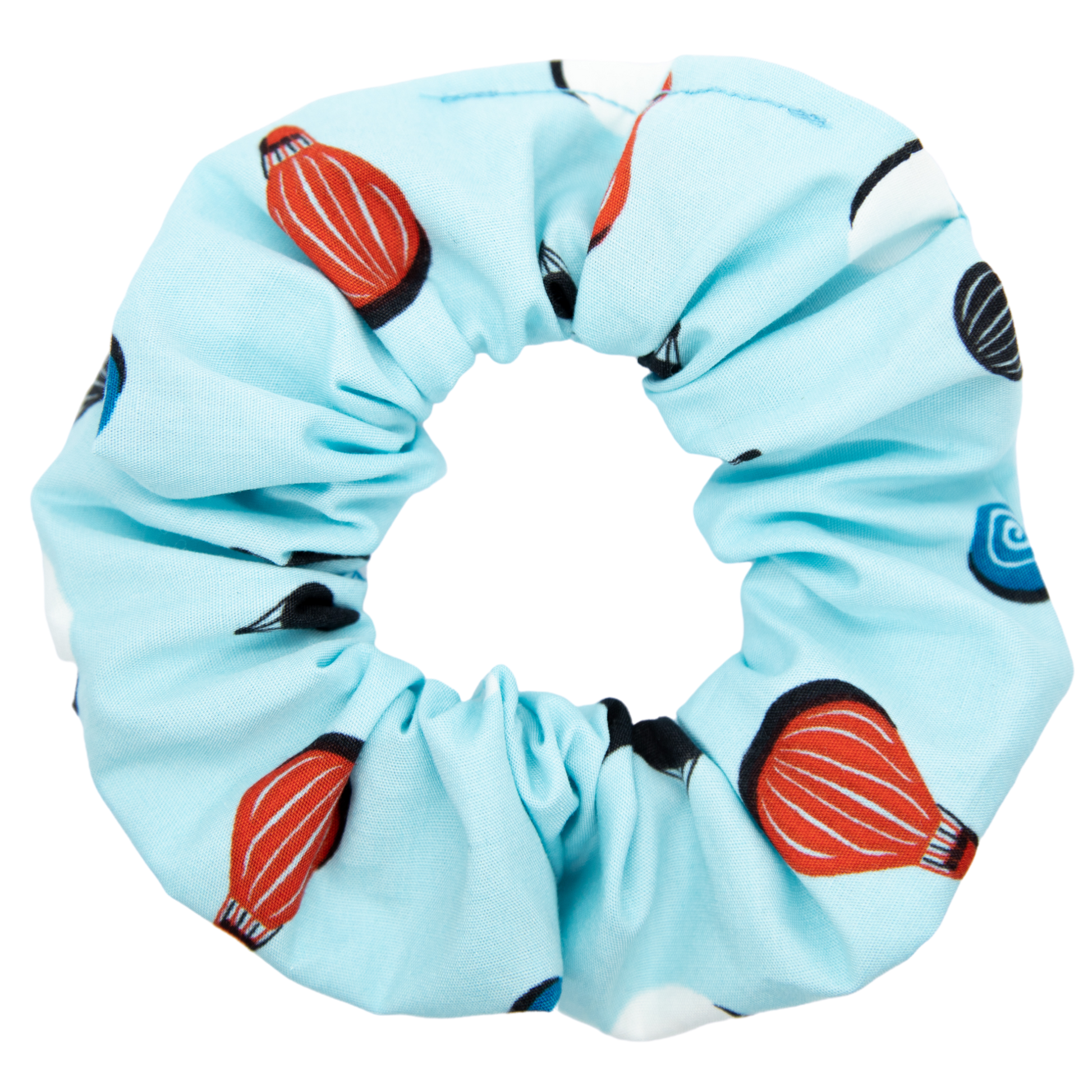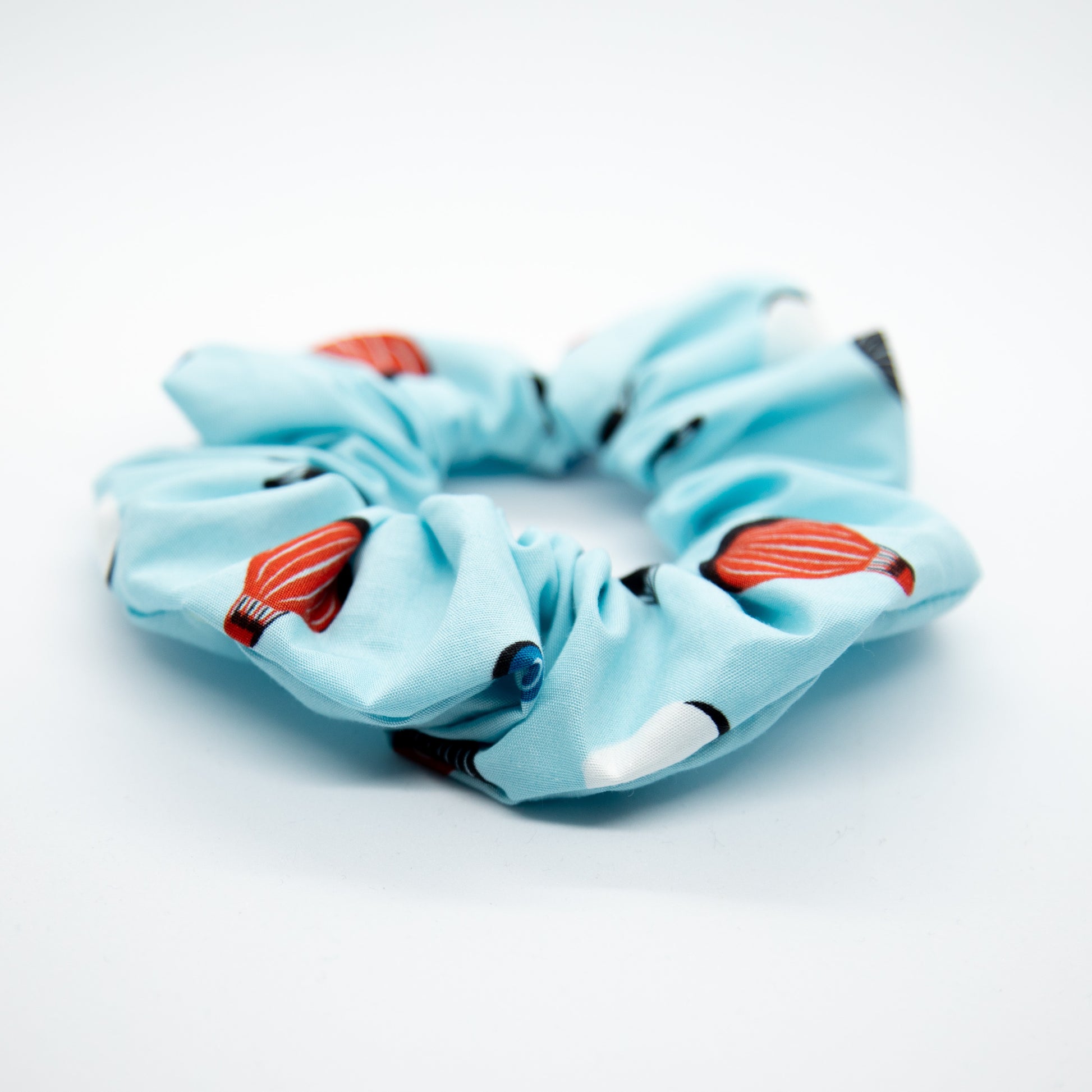 Come sail away into the blue. Red, white, black, and blue air balloons set on a perfect sky in this beautiful blue scrunchie.