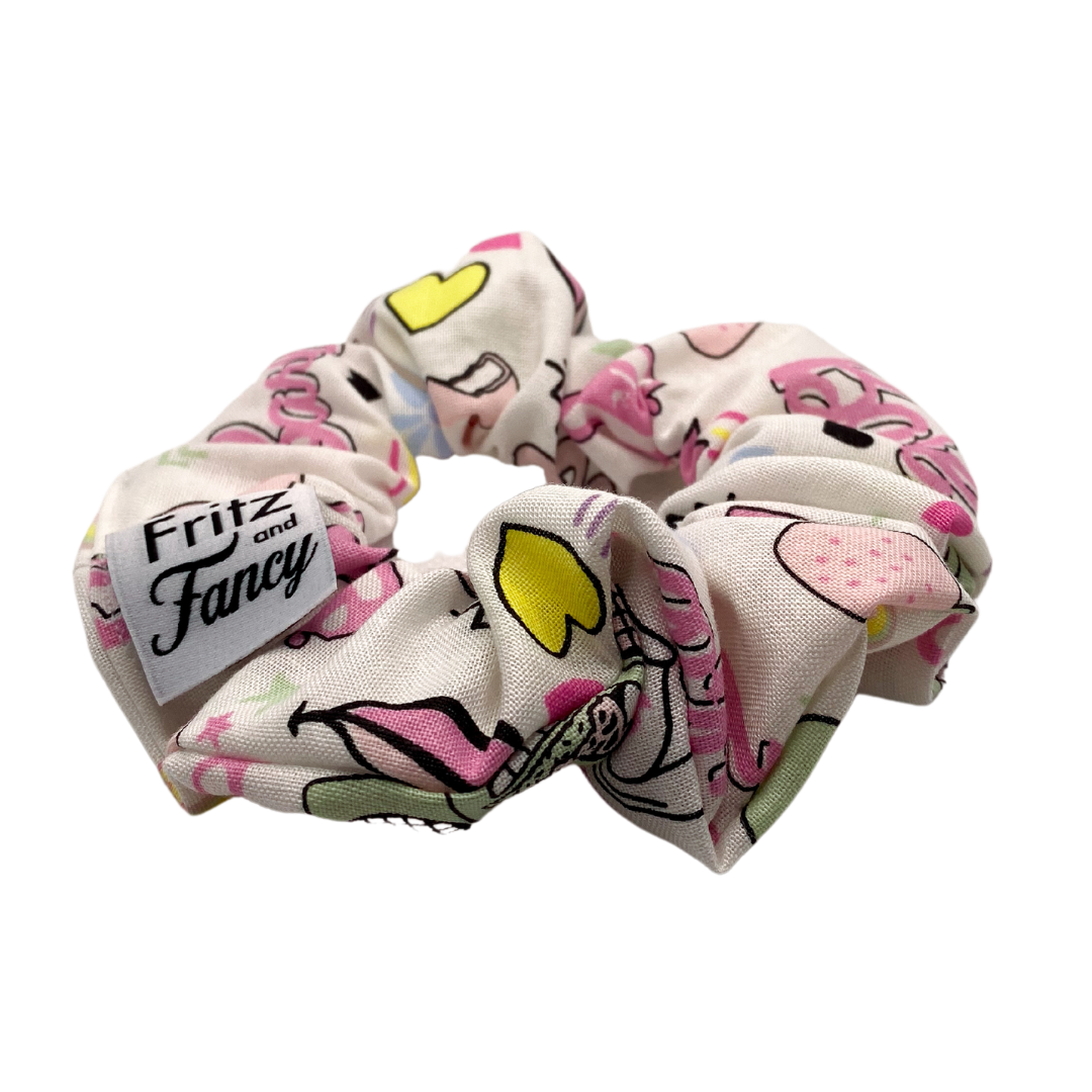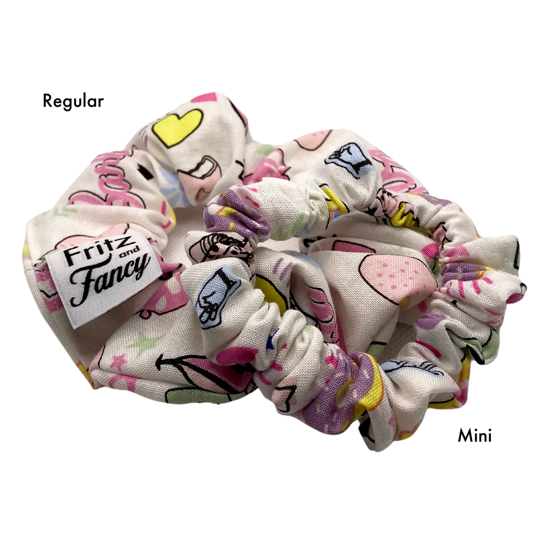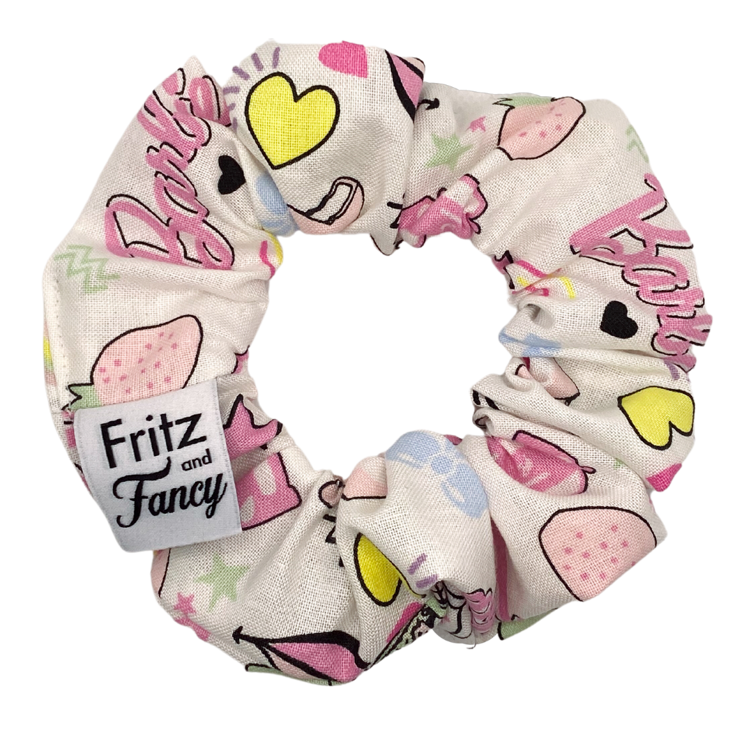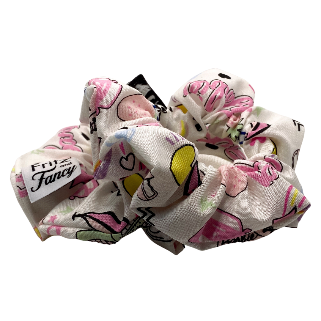 Make a fashion statement with Barbie Icons! This scrunchie is stylishly adorned with classic Barbie icons, boomboxes, vibrant rainbows and more, all printed on high-quality cotton fabric. Wear your Barbie Icons scrunchie and show the world your love of all things Barbie!