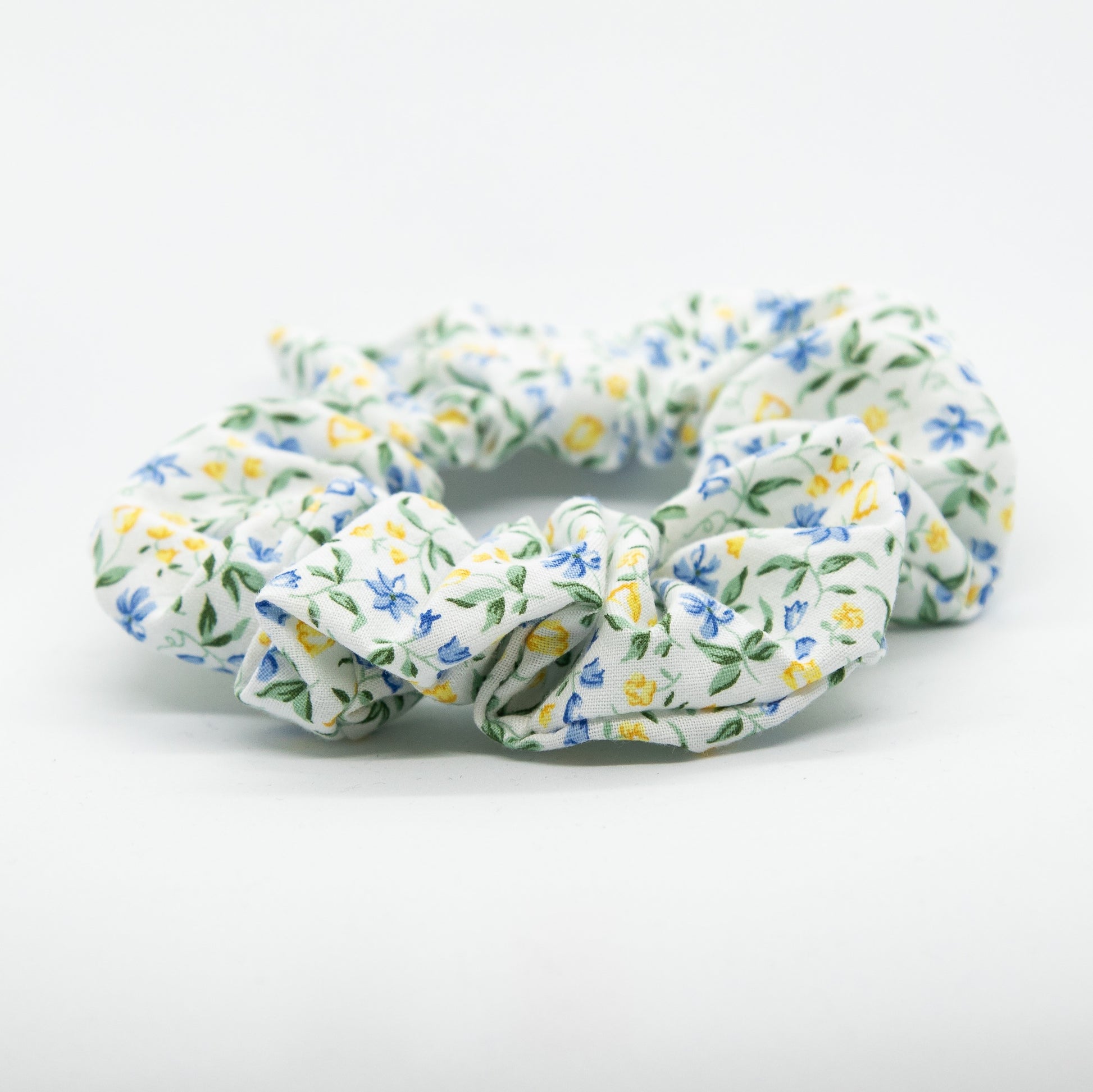 You like the classic prints and this one delivers. Little blue and yellow flowers cover this adorable scrunchie on a simple white backdrop. Made from vintage materials that can't be reordered, this is one scrunchie that won't last long and can't be restocked.