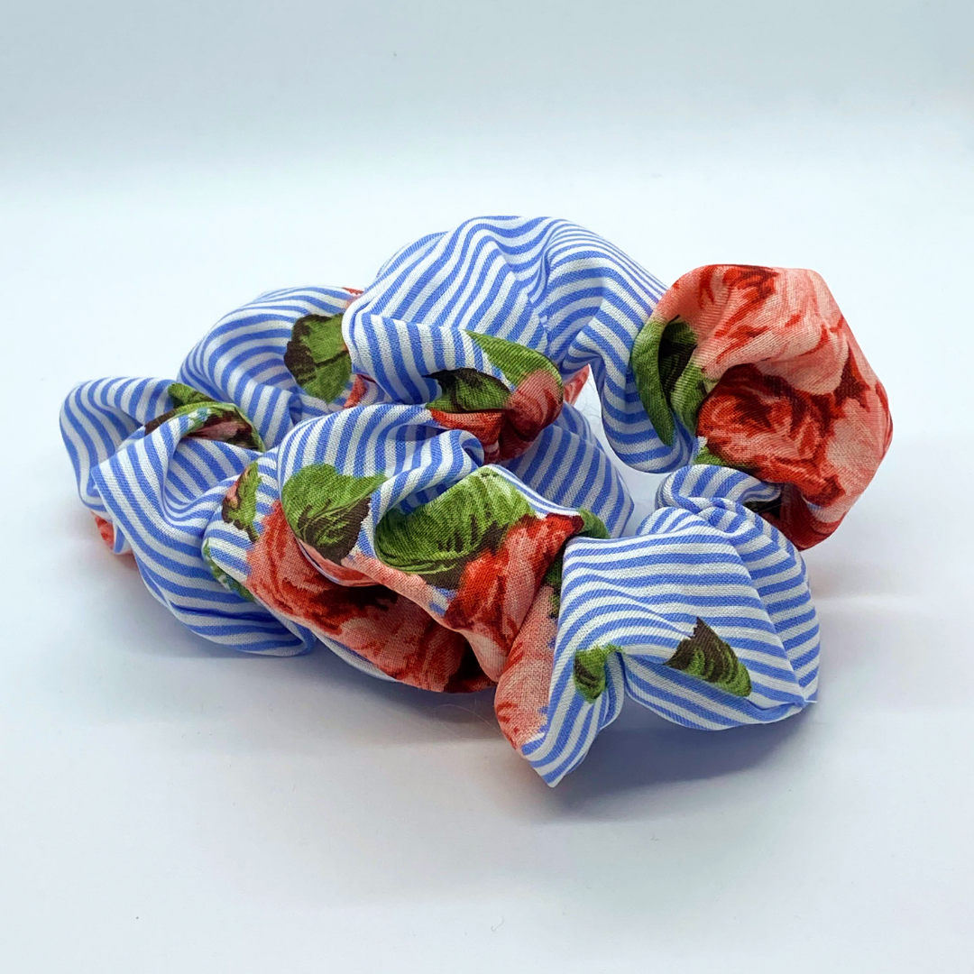 My friend nailed the description of this cotton jersey scrunchie - preppy. I get some real classic Americana vibes from these painted roses on a vintage, upcycled material. I had this material leftover from a custom apron project I made and I can't believe I took so much time to make it into this beautiful scrunchie! The downside, I was only able to make 2 of these, so get yours while you can.