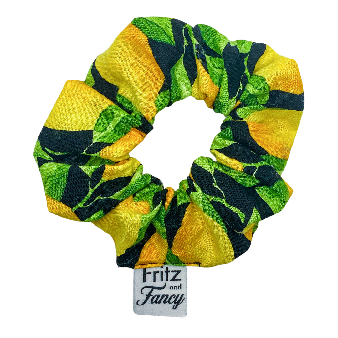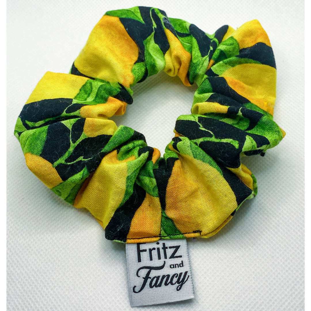 Make your hair look sophisticated and fun with this handmade cotton lemon scrunchie, featuring a black backdrop to make those juicy lemons pop! Don't wait 'til your hair's in a 'squeeze,' add some zest to your 'do today!