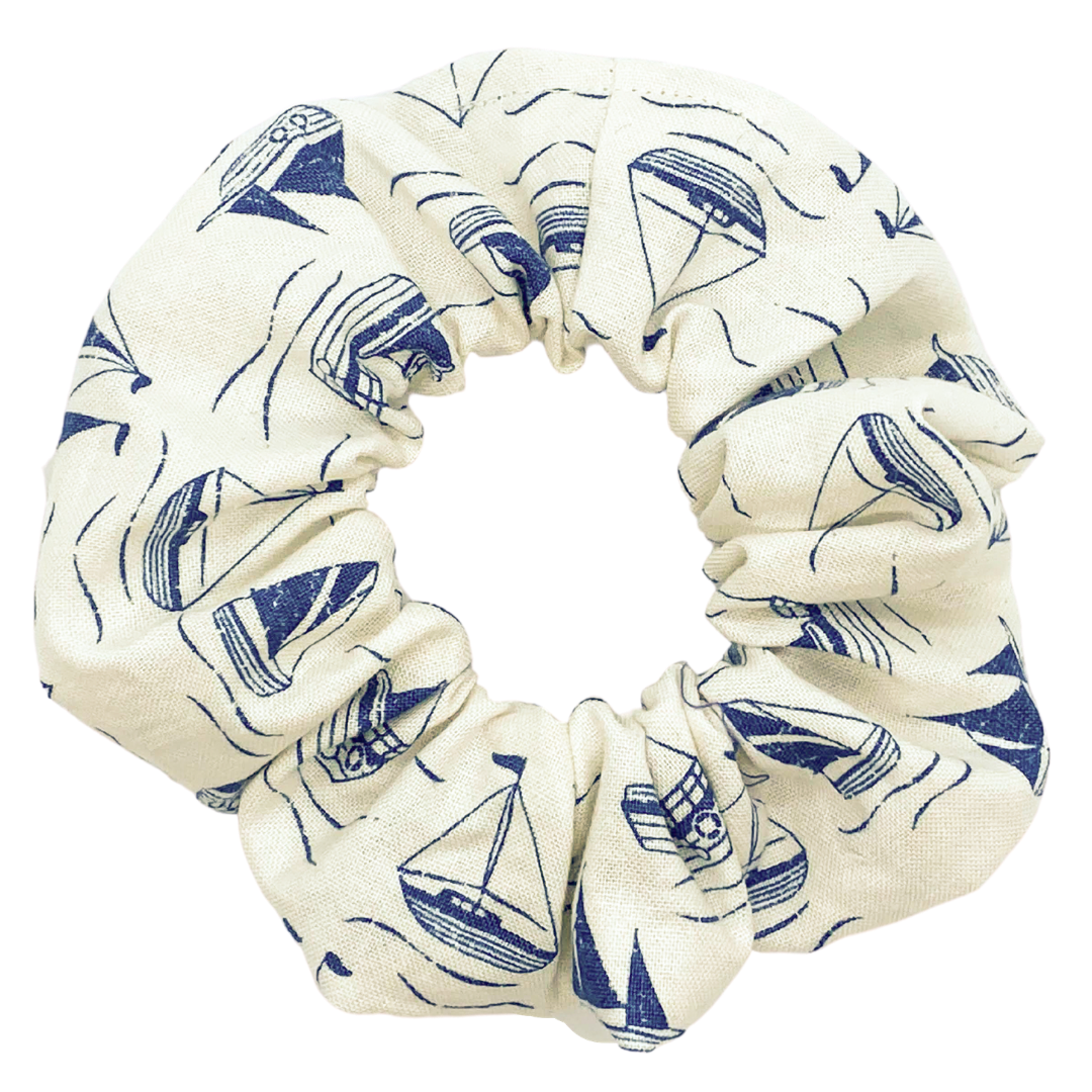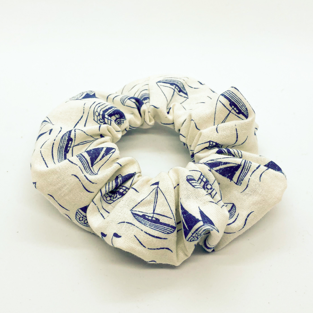 Beautiful blue boats sailing away on a cream-coloured sea. Come sail away with this sweet little scrunchie!