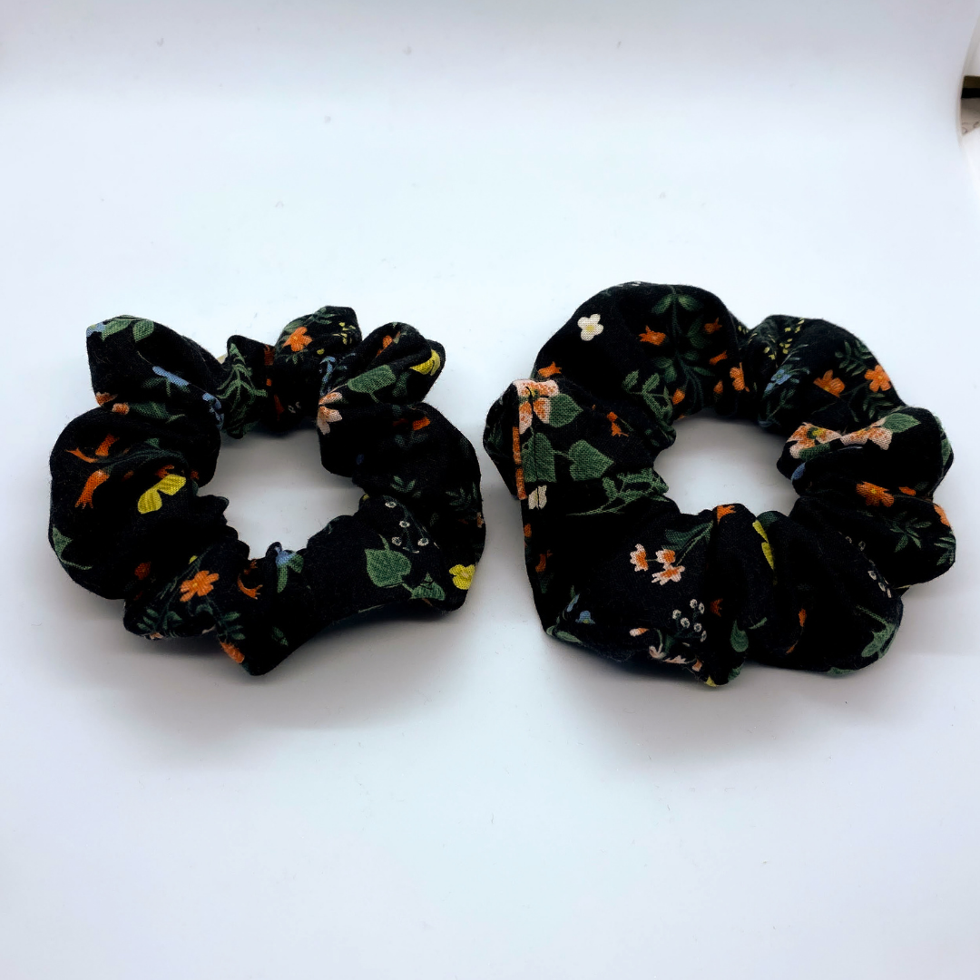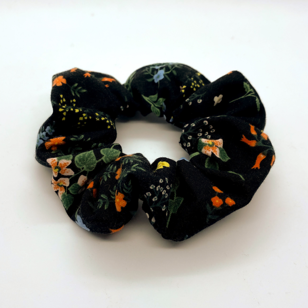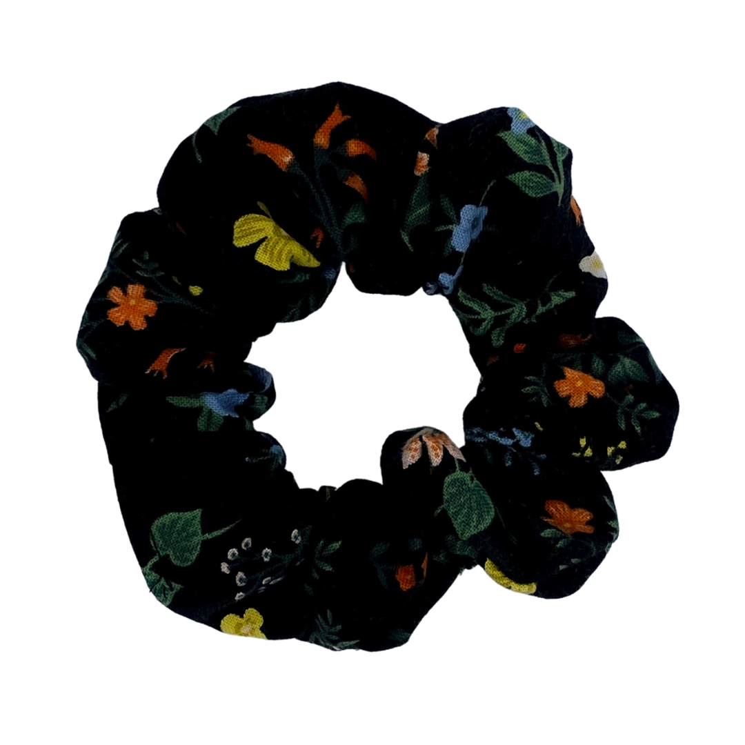 Another gorgeous print by Rifle Paper Company featuring a variety of adorable flowers contrasted with a black backdrop. This scrunchie adds that little pop of colour and sophistication. A truly fancy addition to any scrunchie collection!