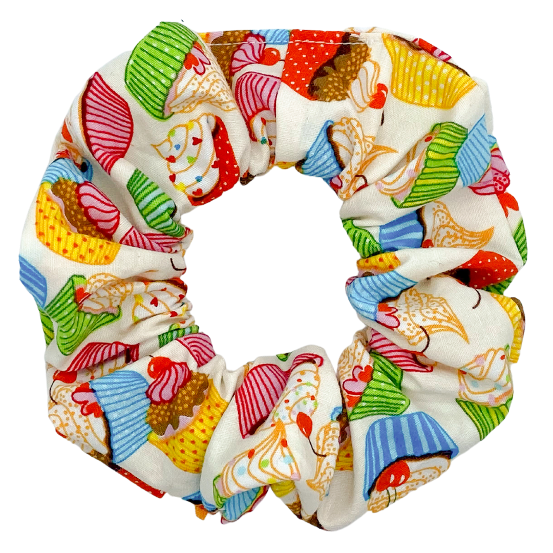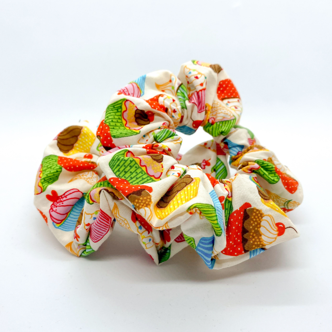 Covered in adorable cupcakes, this scrunchie is colourful perfection! Every cupcake is covered with either sprinkles, chocolate, vanilla, and of course the cherry on top. While I was sewing these beauties, I have to admit, I was getting a sugar craving, and I may have made some muffins to tide me over...