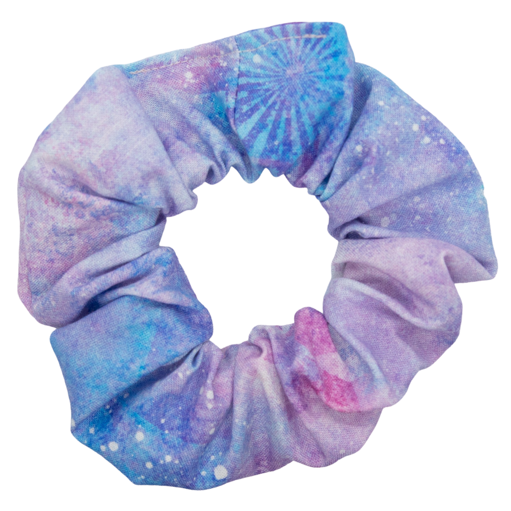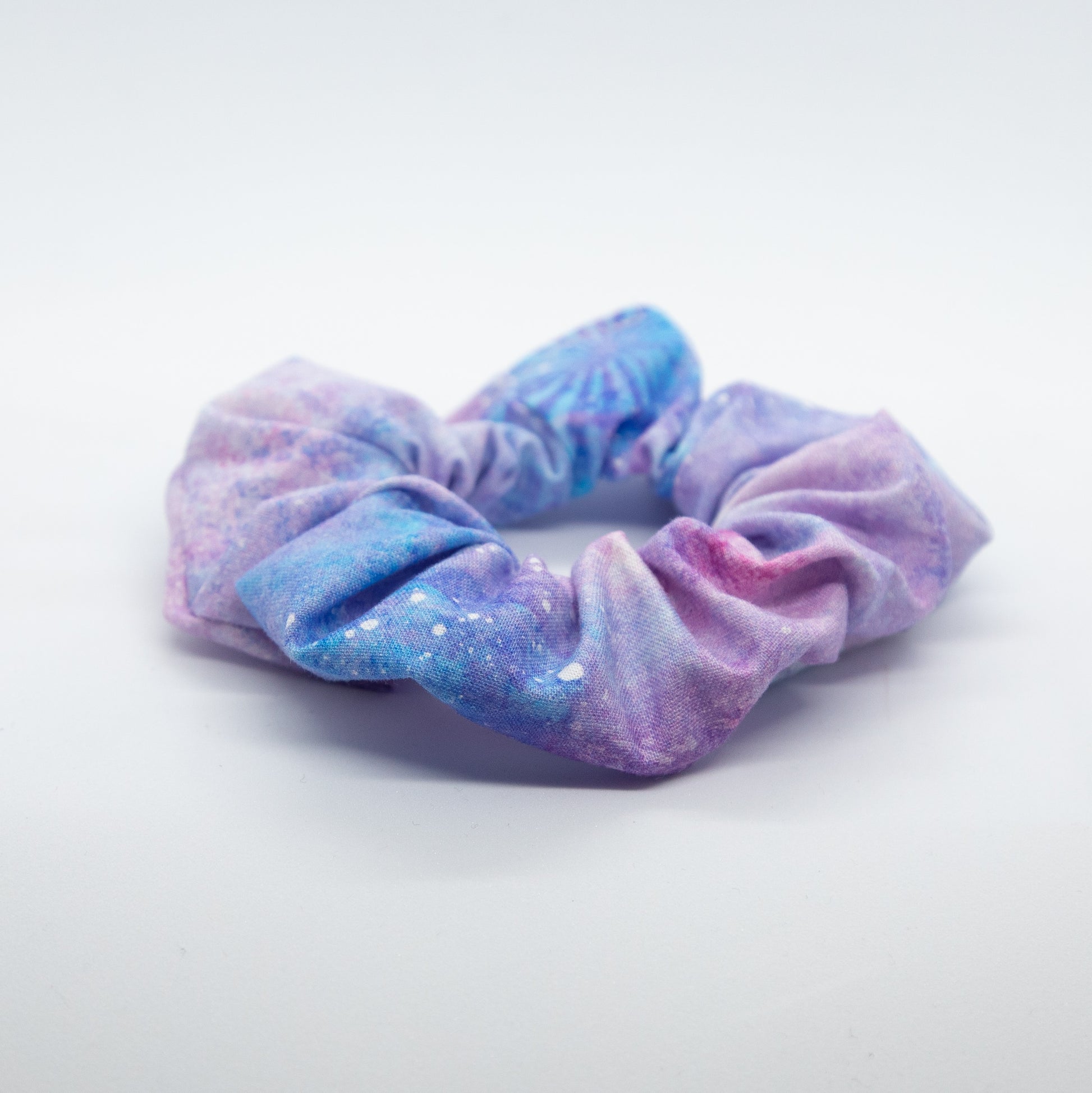 I found the material for this scrunchie when I was searching for more prints for my Galaxy collection and fell in love. The print has a watercolour feel with hints of tie-dye star bursts mixed in. When you zoom in on the image, you'll notice little paint splatters that almost look like a bleach treatment. It's really one of a kind and each one is different from the next. Show some artistic appreciation when you wear this beauty.
